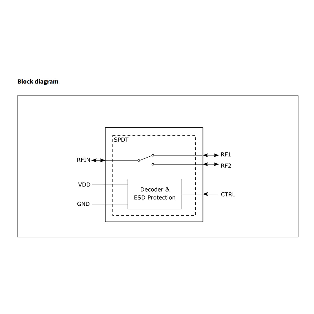 The BGS12WN6 is a broadband SPDT RF switch suitable for various wireless systems, including WiFi \BT, UWB, and cellular. Its high linearity performance and low insertion loss make it an ideal choice for switching transmit signals, e.g., as Tx \Rx switch or as antenna diversity switch. The integrated on-chip CMOS logic allows direct connection to a digital control pin, eliminating the need for extra interface circuitry, thereby simplifying system design, and reducing component count. The isolated port is a reflective short. The device’s flexible voltage supply and control enable easy adaptation to diverse applications and use cases.