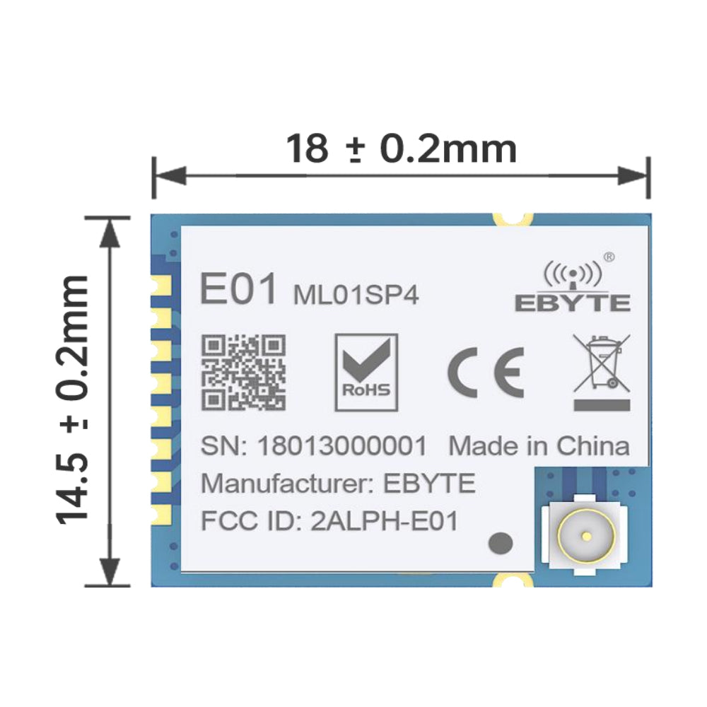 The E01-ML01SP4 is an ultra-small 2.4GHz SMD wireless module with a maximum transmission power of 100mW, based on the Nordic nRF24L01P chip, which is developed independently. The use of the original imported nRF24L01P chip ensures compatibility, and the module features an integrated power amplifier (PA) and low-noise amplifier (LNA). This not only achieves a maximum transmission power of 100mW but also enhances receiving sensitivity, significantly improving overall communication stability compared to products without a power amplifier or low-noise amplifier. The product has obtained authoritative international certifications, including FCC, CE, and RoHS, so users can rely on its performance. It uses an industrial-grade, high-precision 16MHz crystal oscillator. Since the E01-ML01SP4 is a pure RF transceiver module, it requires an MCU driver or a dedicated SPI debugging tool for operation.