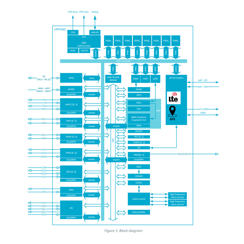 A broad selection of general interfaces and peripherals are included on nRF9160 including 12-bit ADC, RTC, SPI, I²C, I²S, UARTE, PDM and PWM.